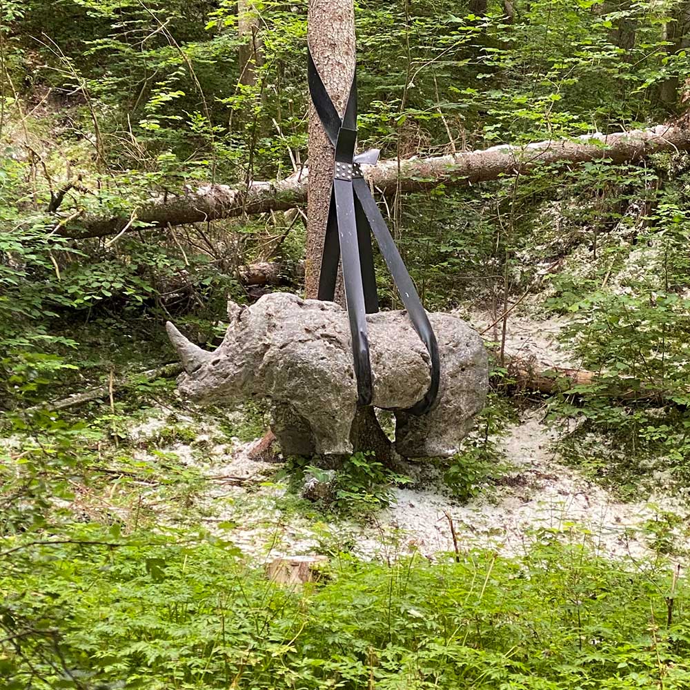 Cette première installation monumentale réalisée sous le titre de Pocomat e mat, pour l’exposition de sculptures en plein air Bex & Arts de 1987 en Suisse romande, met en place de façon significative le système que l’artiste utilisera dès lors dans l’ensemble de son oeuvre. Un volume en béton noir, d’une présence expressive très soutenue, est mis en relation avec une passerelle de bois de plus de cent vingt mètres de long, enfermé dans une cage de fer ajourée et entourée de draps blancs imprimés de noir. Les dessins préparatoires sont nombreux. La passerelle sera démontée puis remontée en forme de cage pour le rhinocéros dans d’autres expositions en Suisse : à Saint-Gall et à Yverdon. La cage sera alors liée à de grands panneaux noirs dessinés, avec chevaux, personnages, oiseaux, strates végétales et minérales.